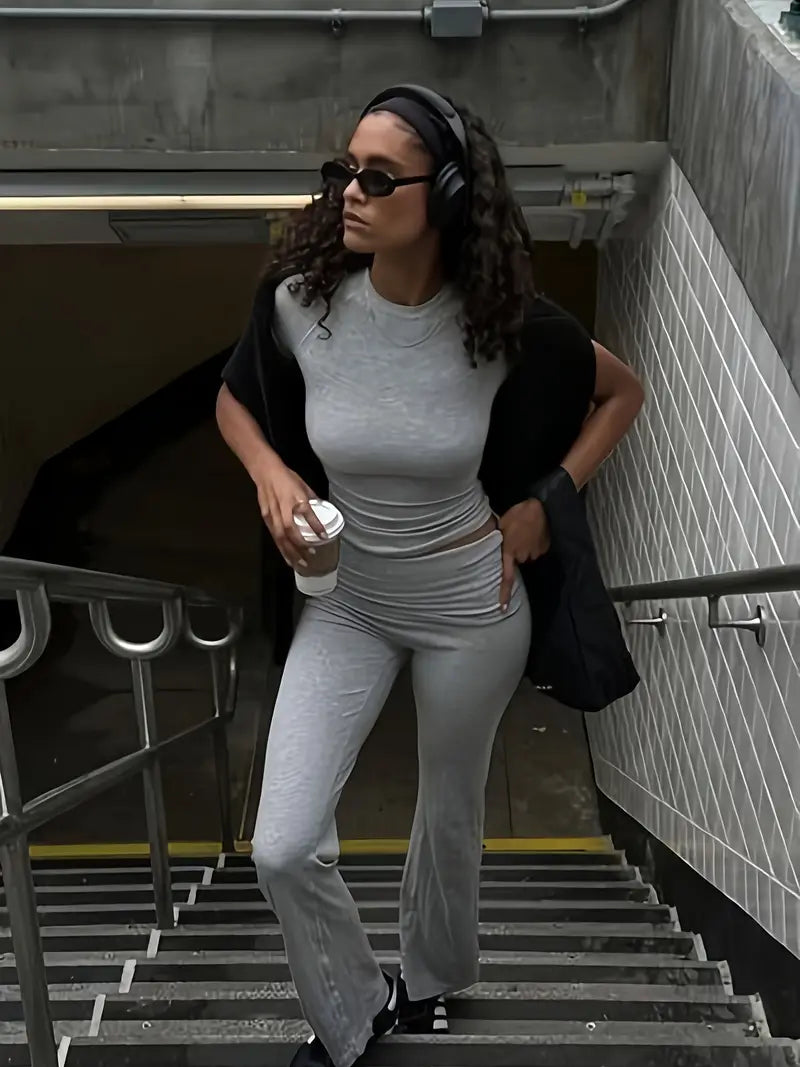 Ben je het zat om steeds te moeten kiezen tussen comfort en stijl? Met de AURORA lounge-set hoef je niet te kiezen! Deze set is jouw ideale metgezel voor knusse dagen thuis of stijlvolle uitstapjes. Het getailleerde T-shirt met ronde hals en de flexibele broek bieden een flatterende pasvorm die ultiem comfort combineert met een trendy uitstraling.