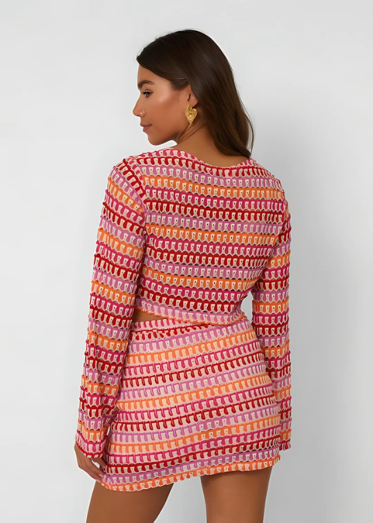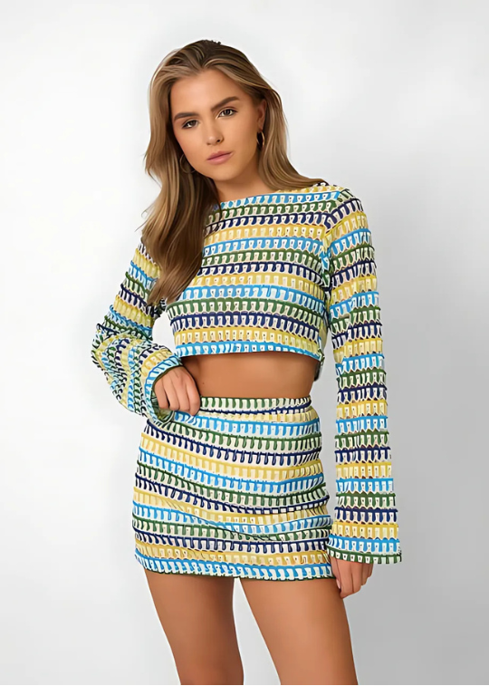 Of je nu op een festival bent, een citytrip maakt of een rooftop-feestje bezoekt – OPHELIA is de perfecte tweedelige set die levensvreugde en stijl op een speelse, moderne manier combineert. Het nauwsluitende cropped top en de figuuraccentuerende minirok laten je silhouet prachtig uitkomen en maken een duidelijk statement: moedig, vrij en vol energie.