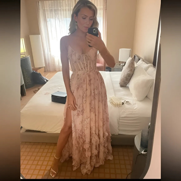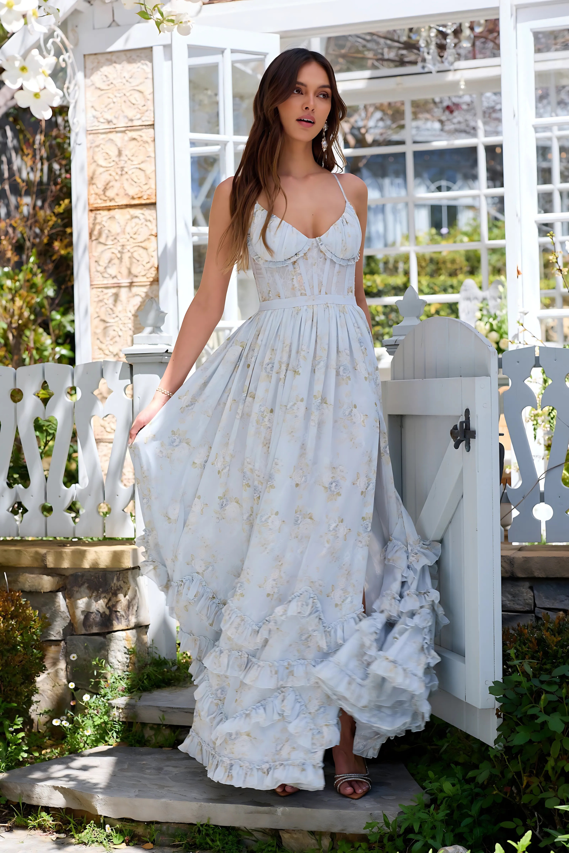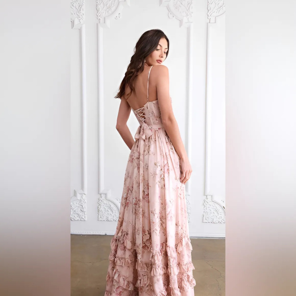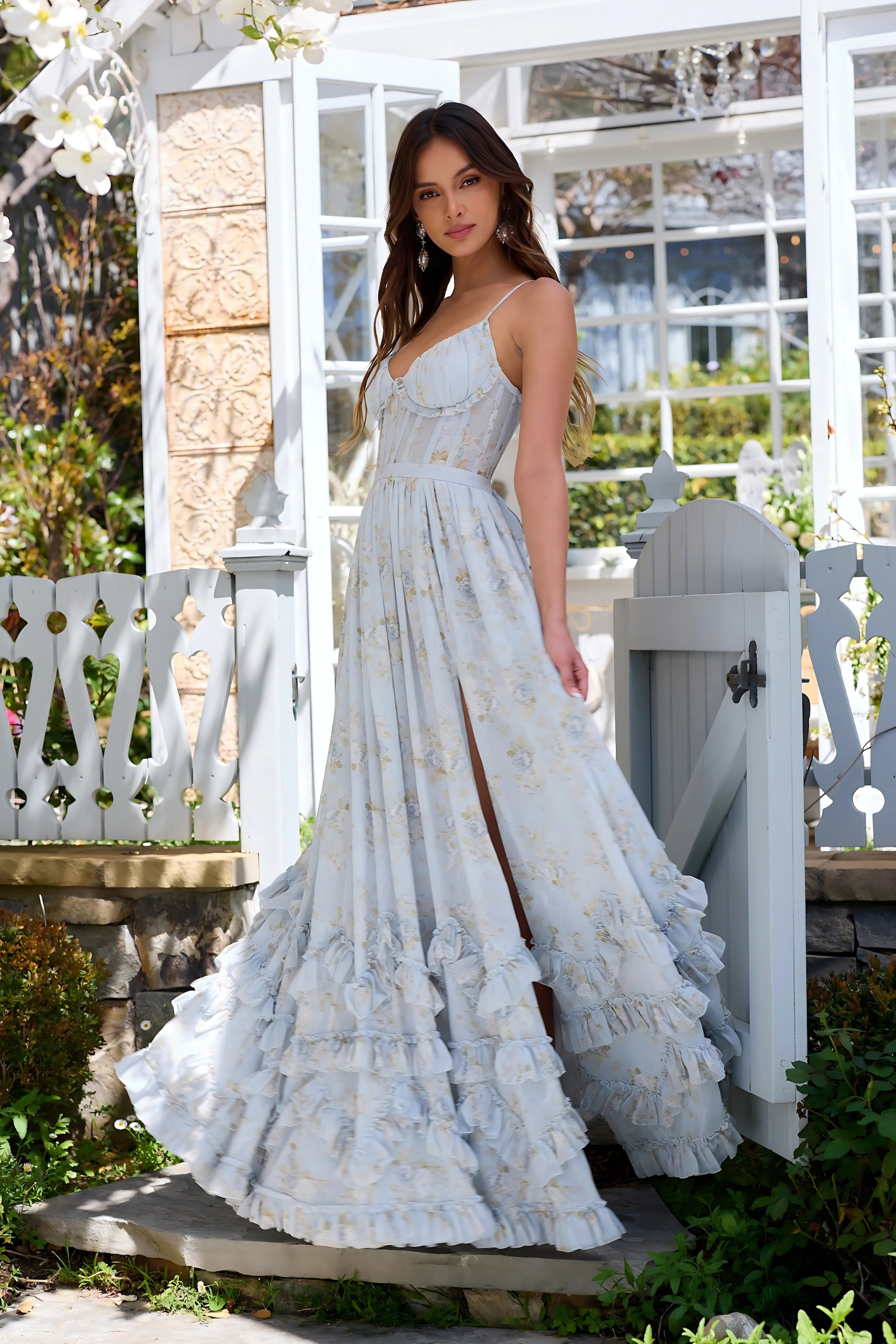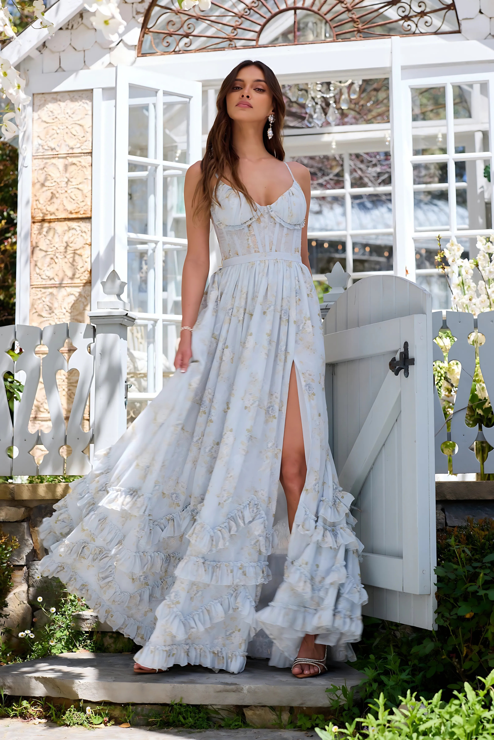 Of je nu wandelt door een betoverende tuin, een stijlvol openluchtevenement bijwoont of danst onder de sterren – VIOLETTA omhult je met stille elegantie en vloeiende magie. Met haar zwierige silhouet, hoge split en romantische ruches word jij de hoofdrolspeelster in jouw eigen zomerverhaal.