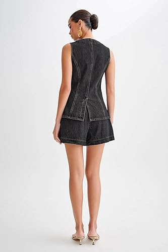 Of je nu door de stad struint, een koffiedate in de zon hebt of een weekendtrip met de meiden maakt – YLVI combineert nonchalante elegantie met een vleugje retro. De mouwloze top met gouden knopen en de wijde short zorgen voor de perfecte mix van structuur en lichtheid – ideaal voor krachtige looks met een urban uitstraling.
